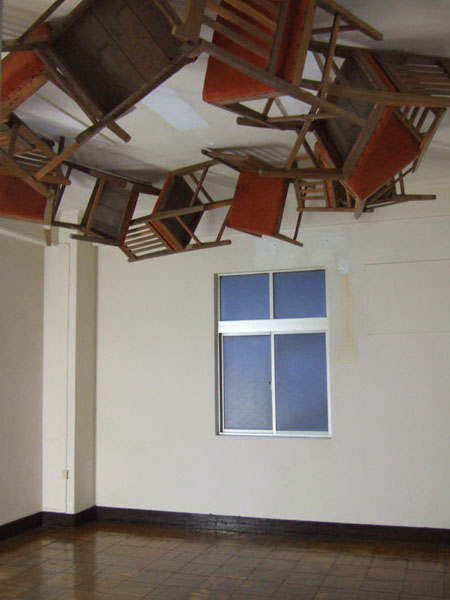 土屋公雄さんの作品。天井に円をえがいて椅子が吊ってあります。不思議な感覚。