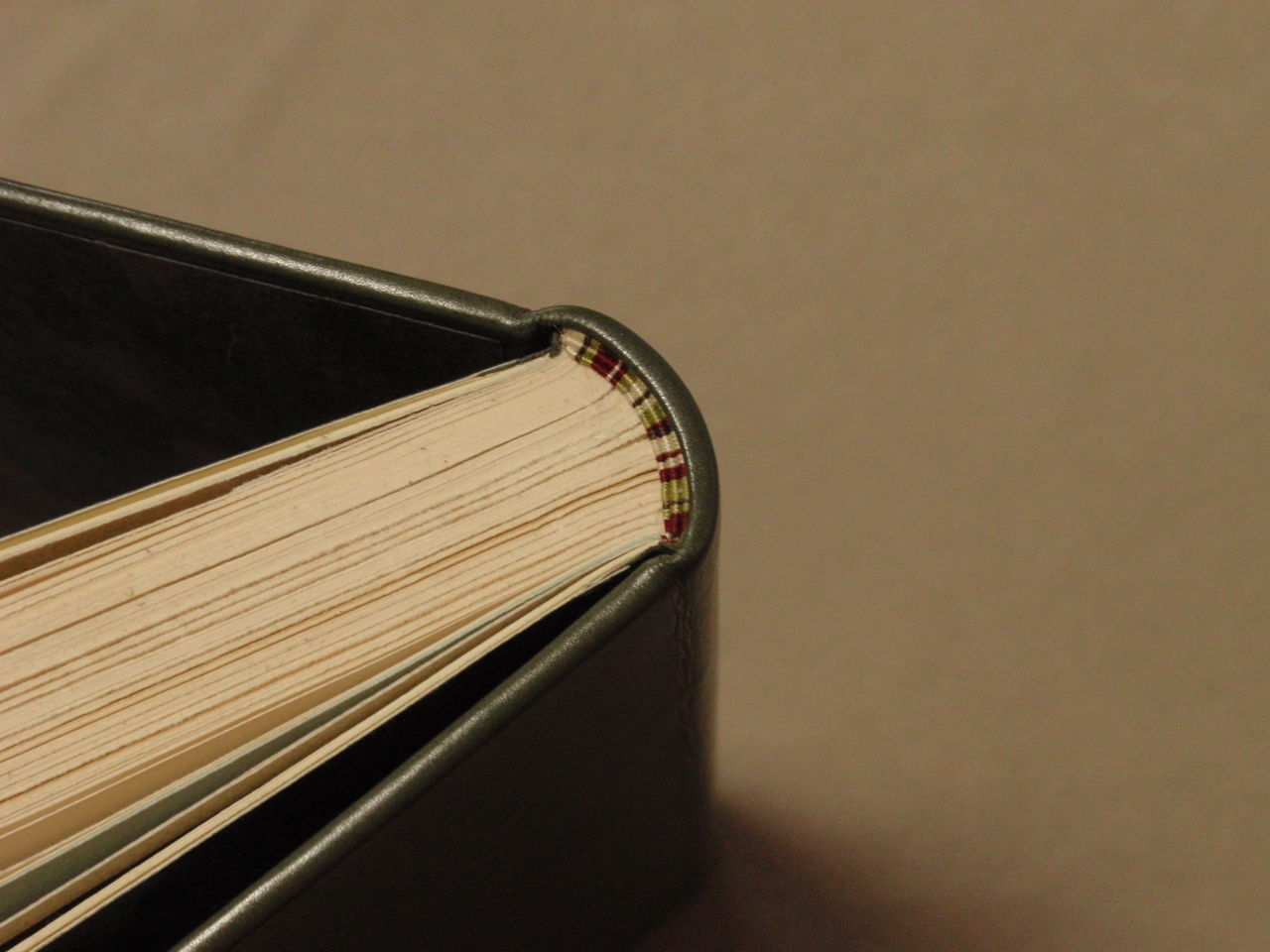 小口側の上下に亘るように革を貼る形の半革装(下図参照)。