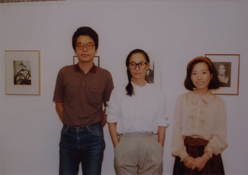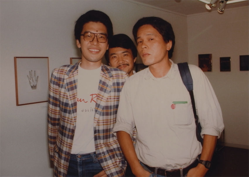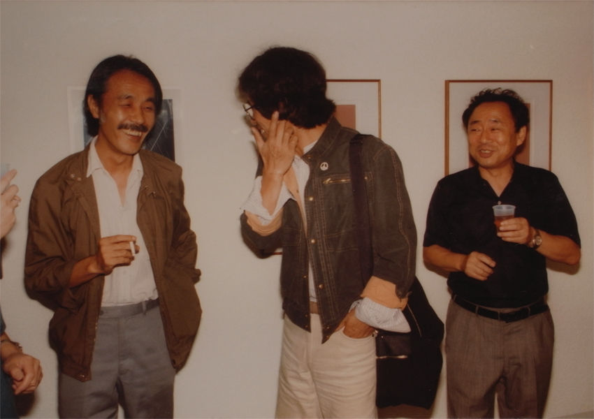 左から筆者、山内十三男、(故)川端祥治の各氏レセプションは17時からで、当時のノートを確認すると64名の参加(12日間で604名)となる大盛況。ビールを飲みながら多くの美術関係者とお話をする事ができた──若い友人の高嶋清俊さんに写真を撮ってもらったので、幾枚かを紹介しておきたい。改めて見直すとジュリエットにサインをしてもらったTシャツを着たわたしのうれしそうな顔にあきれる、来て頂いた方々もみなさん笑顔で、良い時代だと懐かしい。会期中には、名古屋時代にテレビ番組の『土曜日の虎』を観て以来の憧れの人、女優の江波杏子さんがおいでになられ、「わたしも好きなんです」と言われたときには、嬉しかった。