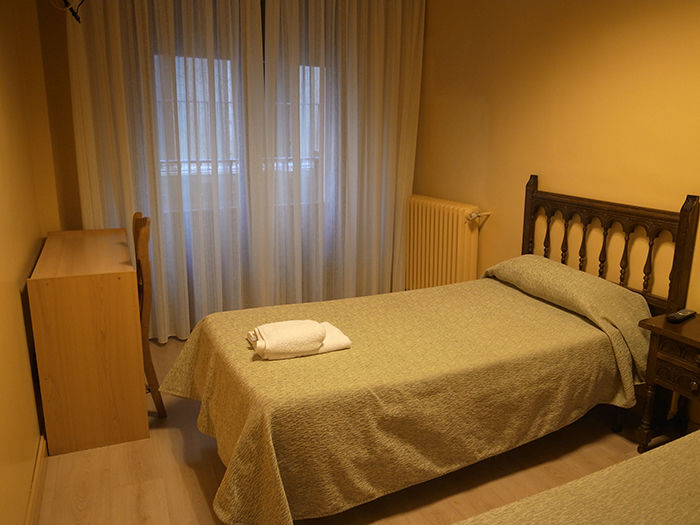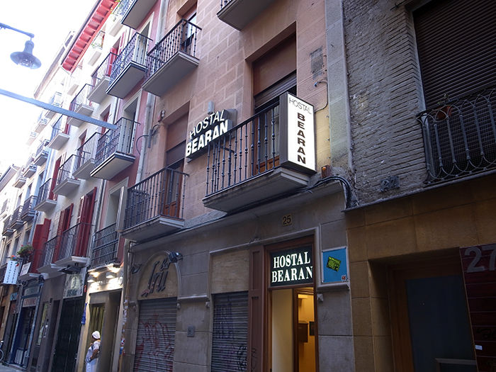 パンプローナ2日目、8:00起床。カフェ・イルーニャで朝食。パンを食べ、コーヒーを片手に今日のプランを考える。アルベルゲは病気やケガといった特別の理由が無い限り連泊は出来ないので安い宿を探す。アルベルゲは何より安いし(5~10ユーロ程度、寄付のみのところとか無料のところもある)、自炊の設備のあるところも多いので、長期にわたる巡礼には本当に有り難い。そのかわり大部屋にずらっと二段ベットが並んでいるだけなので、自由に使える空間はベットの上だけであり、プライバシーは全くない。夜はイビキで寝られないということもあり、これが続くとストレスも溜まってくる。贅沢ではあるがここパンプローナでは宿の部屋を取ることにする。日本から持ってきた自家製の冊子(『「地球の歩きかた スペイン』から巡礼路沿いの街の部分だけを切り取ってホッチキスで止めたもの)を取り出し、パンプローナの宿泊ガイドを参考にホテルを探す。シングル一泊38ユーロからと、掲載されている中で一番安い「ホテル・ベアラン」に決める。祭りの時期さえ外せば基本的にはのんびりした町なので部屋は予約なしでも大丈夫だった。個室の快適さを満喫。自分だけの空間で寝たのはこの巡礼で初めてであった。