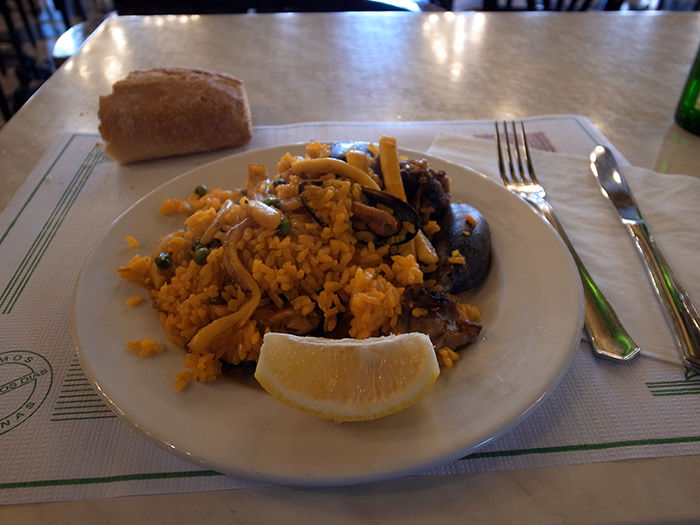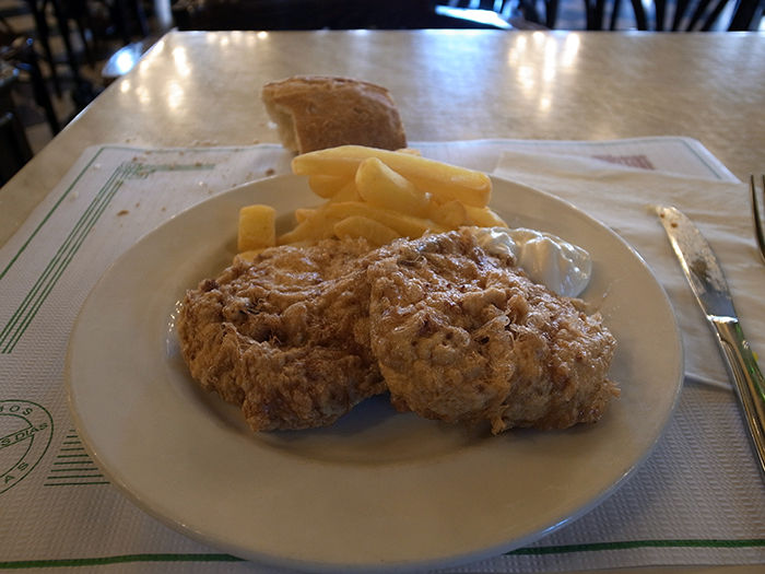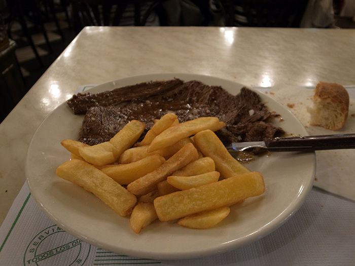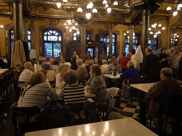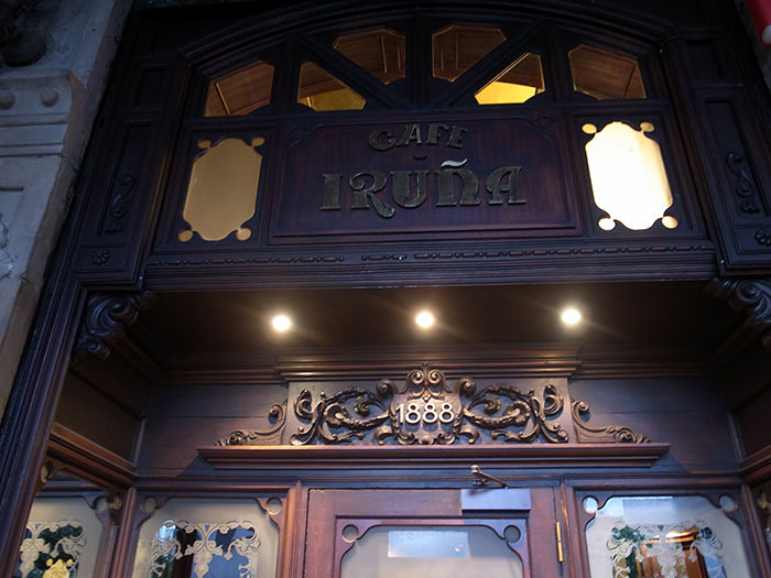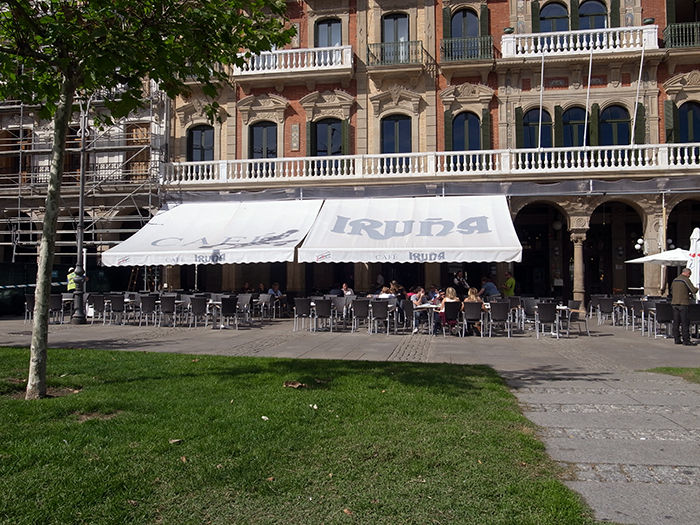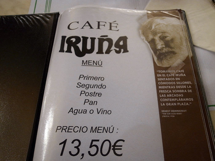 夕食へ向かう。ヘミングウェイがよく訪れたというカフェ・イルーニャで食事を取る。イルーニャとはバスク語で「パンプローナ」の意味で、カスティーリョ広場に面する1888年創業の老舗のカフェ。アールデコの店内は広くて豪華。料理はメヌー・デル・ディア(二品とデザート、ミネラルウオーターかワイン)で13.5ユーロ。
