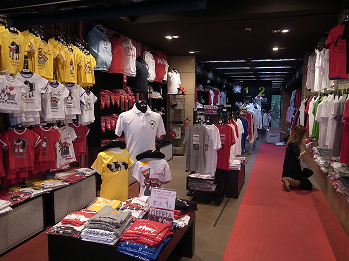 サン・フェルミン祭公式ショップTシャツなど多くのグッズが並ぶ