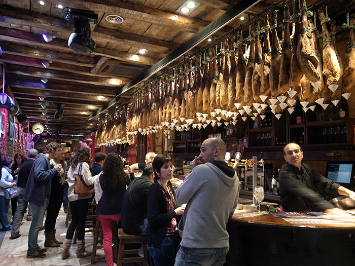 夜のパンプローナへ繰り出し、バルを2件はしごする。特に2件目のお店が印象的でたくさんのハモン(スペイン語でハムの意味)がぶら下がっている。スペイン名物の小皿料理タパスをつまみながらナバーラワインを共にする。パンプローナの夜は更けていった。