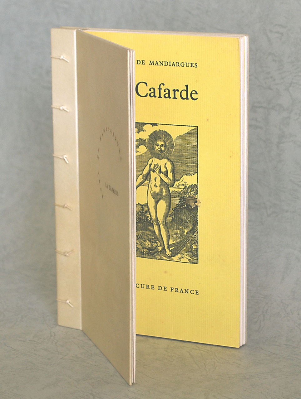 綴じ付け製本。麻紐を綴じ糸で抱き込むようにかがり、その麻紐の端を表紙芯紙に通すことにより、ミゾのない形の本にする。
