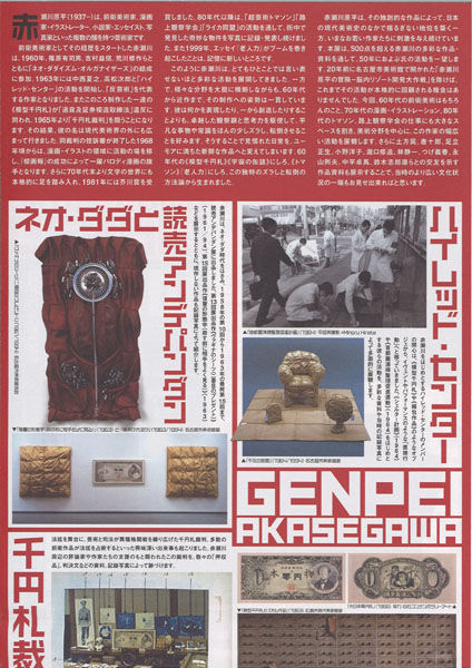 前衛美術家としてその経歴をスタートした赤瀬川は、1960年、篠原有司男、吉村益信、荒川修作らとともに「ネオ・ダダイズム・オルガナイザーズ」の結成に参加。1963年には中西夏之、高松次郎と「ハイレッド・センター」の活動を開始し、「反芸術」を代表する作家となりました。またこのころ制作した一連の《模型千円札》が「通貨及証券模造取締法」違反に問われてしまい、1965年より「千円札裁判」を闘うことで、その名は現代美術界の外にも広まって行きました。同裁判の控訴審が終了した1968年頃からは、漫画家・イラストレーターの領域に活動の場を移し、『櫻画報』の成功によって一躍パロディ漫画の旗手となります。さらに70年代末より文学の世界にも本格的に足を踏み入れ、1981年には芥川賞を受賞しました。80年代以降は、「超芸術トマソン」「路上観察学会」「ライカ同盟」の連載や活動を通して、街中で発見した奇妙な物件を写真に記録・発表しました。また1999年、エッセイ『老人力』がブームを巻き起こしたことは、記憶に新しいところです。