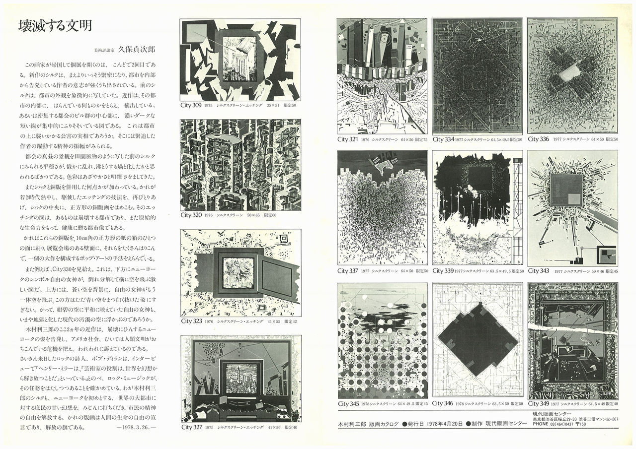 利三郎先生は師範学校を出て教師となりますが、その後法政大学に入学、谷川徹三に学びます。戦後民主主義の最も輝いていた時期に、労働者の街・川崎で版画の頒布活動をしていました。30歳で画家を志し、1964年40歳のときに渡米します。以来ニューヨークで作家活動を展開し、都市の崩壊と再生、そして宇宙をテーマに描き続けた半世紀でした。