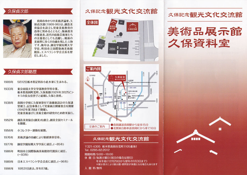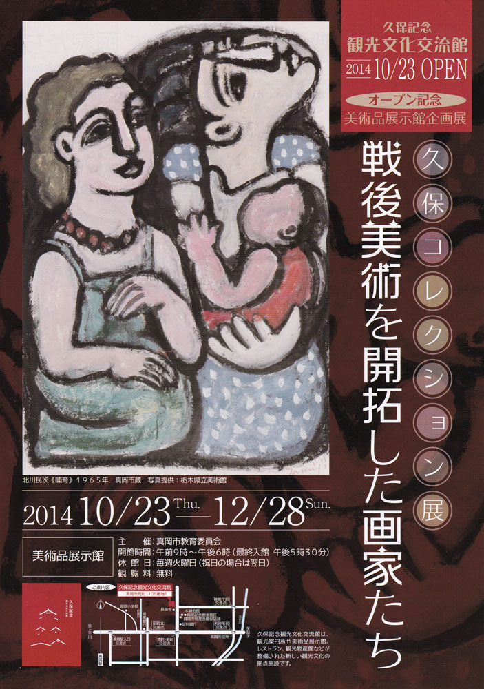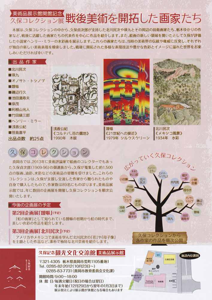<真岡市では、2013年に美術評論家で絵画コレクターでもあった久保貞次郎(1909-96)の御遺族から、久保が蒐集した約1,500点の版画、油彩、水彩などの美術品の寄贈を受けました。これらのコレクションは、久保が支持し交流した作家から贈られたものや自身で購入したもので、作家数は89名にものぼります。美術品展示館では、年に数回の企画展を開催し久保コレクションを順次公開いたします。>