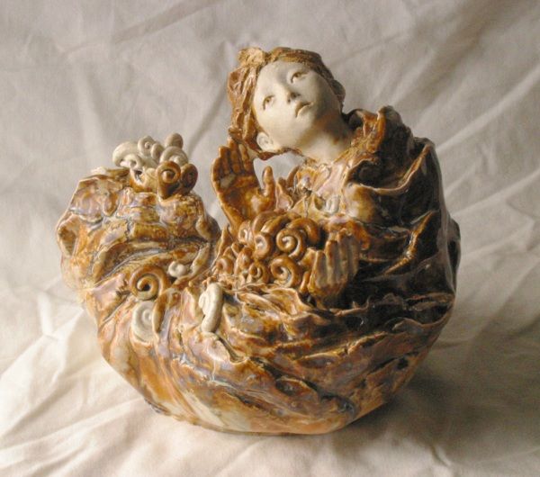 写真は、帰ってから作った陶による習作の部分写真で、座っている森田さんの背中側です。