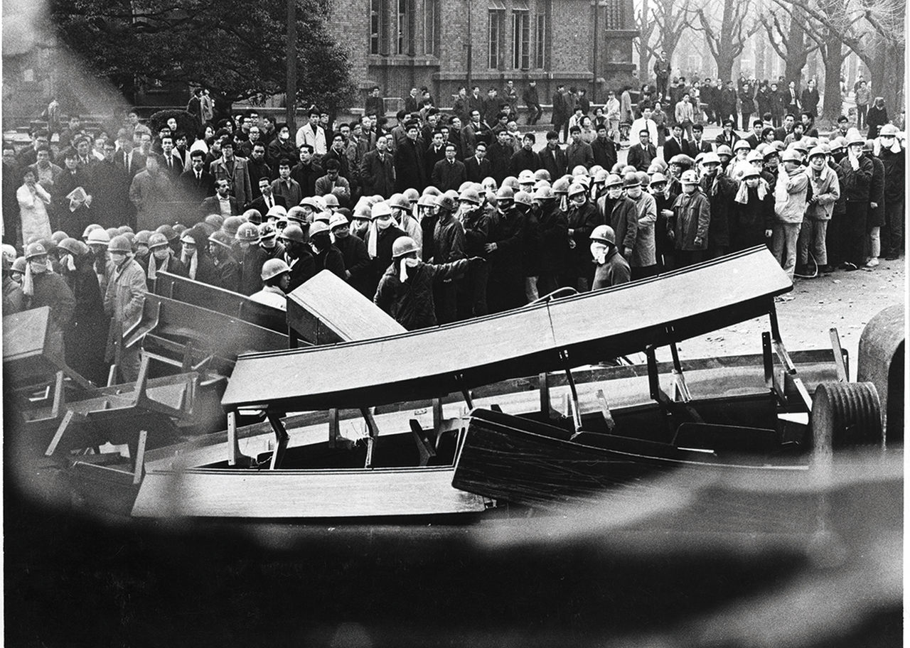 報道カメラマンは何かが起きてはじめて現場に飛んで行く。前後の脈絡を飛ばして緊急事態そのものにレンズをむけるから、写真に写るのは非日常的な光景である。ところが、バリケードの内側にいる人にとってはそうではない。彼らは封鎖された空間のなかで寝て起きて食べる。荒れた校舎のなかでしばし生活しているのだ。この写真はそちら側から撮られたものだ。封鎖の内側から外を眺めたとき、目の前の世界はひっそりと静かな、遠く隔たったものに映ったのである。ふたつの世界を分かっているのは階段教室の机であり、積み上げられたフォルムが人間以上に強いエネルギーを放っている。