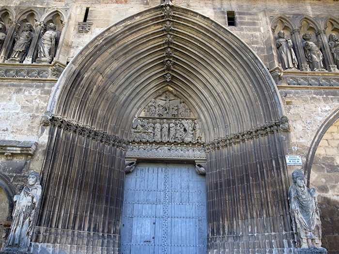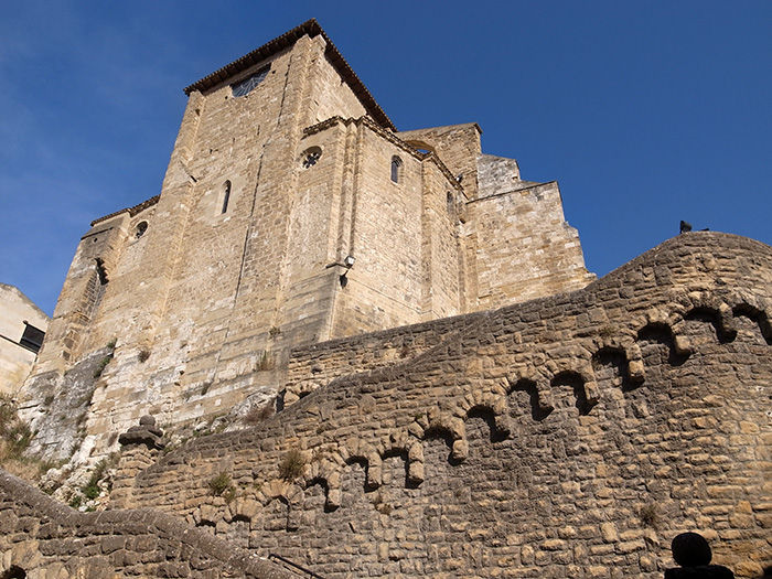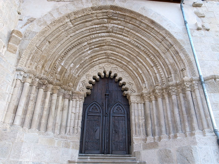 街に入って右の丘の上にはサン・ミゲール教会がある。12世紀の建築であるがその後多くの改造がなされ、ロマネスク教会としての見どころはこの北の門の正面ファサードに残る保存状態のよいロマネスク彫刻群である。写真だと見にくいかも知れないが、中央タンパン正面にキリスト像、その向かって左上に人間の姿をした聖マタイ、右上に鷲の姿をした聖ヨハネ、左下に獅子の姿をした聖マルコ、右下に牛の姿をした聖ルカの四福音書記者が取り囲み、その左に聖母マリア、右に使徒ヨハネが刻まれている。柱頭彫刻として「ヨセフの夢」、「エリサベツのマリア訪問」、「幼子キリストと羊飼いへのお告げ」、「キリストの宮参り」、「三博士の礼拝」、「エジプトへの逃避」、「ヘロデ王」、「嬰児虐殺」、とキリストの誕生物語が刻まれている。その両側には聖人たちの彫刻が並び、左側下段右端に、この聖堂が献げられた聖ミカエルが彫られている。
