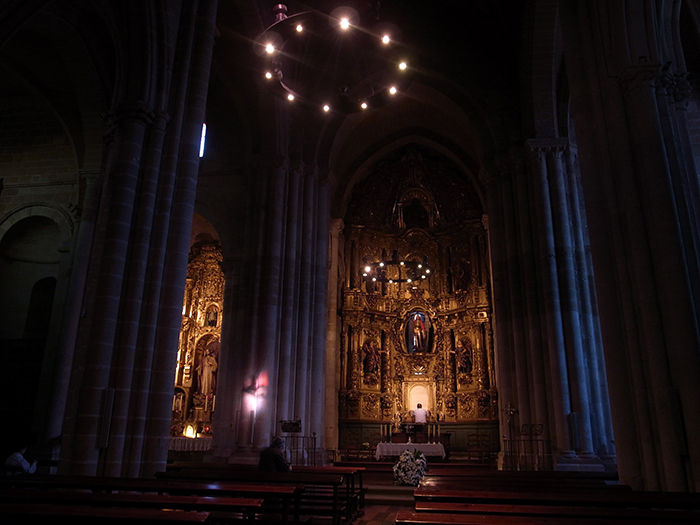 内部も重厚な石の空間が人間を包み込むような魅力的な空間であった。ただ一つ、正面のゴテゴテした金色の祭壇だけはどうも私の趣味には合わないのである。レコンキスタの勝利の余韻と新大陸の発見、運び込まれたおびただしい黄金が、質素であったが高い精神性を持ったロマネスクの空間に、これみよがしの金満主義を持ち込むことになったのであろうか。自分としては千利休の待庵に豊臣秀吉の金の茶道具を持ち込むような具合の悪さを感じてしまうのである。