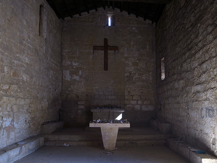 Estellaの手前、野生のオリーブに囲まれた教会を見つける。中へは入れないのだろうと思いつつも、万に一つを期待して正面まで足を運ぶ。そうしたら、なんと入り口の扉が開いていたのである。不思議に思ったので中を覗くと、そこは廃墟のように荒れ果てていた。ずっと使われてないのだろう。ひどくさびれている。決して綺麗とは言えず、むしろ汚い。ただ、空間だけが濃密にあるのだ。中は伽藍。入り口と一つだけの小さな窓。何もないが空間がある。綺麗ではないことは確かであり、美しいのかどうかもわからない。ただ、粗い石をむしろ無造作に積み上げて生まれた場所がひとつのたしかな空間となってそこにはあった。そしてそれはどんな豪華できらびやかな装飾や調度によってもつくり出すことのできない実に豊かな空間であった。