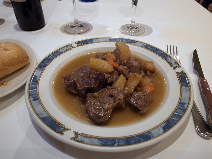 ディナーのメインディッシュ 牛肉の煮込みサラダとデザート(もちろんパンとワインも)がついて15ユーロ