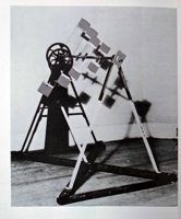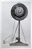 以上が経緯の概略である。今日から振り返ると、ロト・レリーフはマルチプルの先駆的な作品であったばかりでなく、機械による動きを導入した点でキネティック・アートの嚆矢とも考えられている。同様の作品としてデュシャン自身の「回転ガラス板」(図5-5)や「回転半球」(図5-6)、ナウム・ガボのモーターを使った彫刻、モホリ=ナジの動く立体、アレクサンダー・カルダーの「モビール」、ブルーノ・ムナーリの「役に立たない機械」なども挙げられる。ただし、しばしばキネティック・アートの最初の展覧会と位置付けられる、パリのドゥニーズ・ルネ画廊の「動き」展(55年4月)に出品されたのは「回転半球」で、ロト・レリーフは展示されなかったようである。