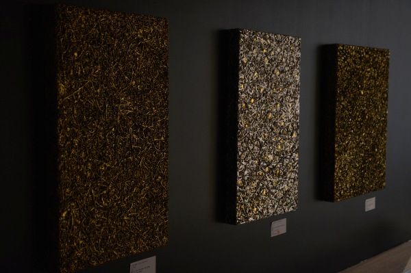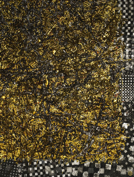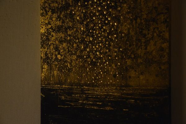 箔画(木パネル、漆、金・銀・プラチナ箔、石炭、樹脂、透明アクリル絵具)