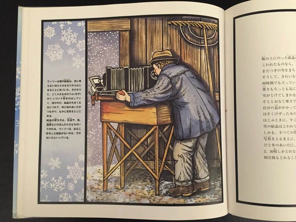 17歳でカメラを手に入れて以来、一つ一つ形の違う雪の結晶の美しさを捉えることに生涯を捧げたウィリーは、50年後晩年になって、雪の研究者として高く評価されるようになりました。当初は周囲の人に「土とおなじで、めずらしくもない」と興味を示されなかったにもかかわらず、ひたむきに雪の結晶を探求し、その形の美しさと神秘を追い求めたウィリーの姿勢には胸を打たれるものがあります。また、このように写真を撮り続ける営みや、写真の見方や価値を、歴史的な背景や写真の技術的な側面も含めて子どもにもわかるように、平易な言葉で語りかけ、描き出している絵本の構成も見事だと感じました。雪降る季節に、写真の歴史を身近に感じられる一冊としてお薦めします。