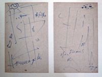 「タクシーで帰ろうとしてダリの家を眺めるとテラスからかれの半身が見えたので、私は駆けだしていって別れをつげた。すると玄関へ出てきて、『はいれ、紹介する人がある』という。思いがけぬダダの元老マルセル・デュシャンがテラスの籐椅子にかけてにこにこしていたのである。私に向って、『あなたはシュルレアリスムに関係した詩人か?』ときいたら、そばからダリが『日本の』とつよく附け加えた。私は意外な遭遇に下手なフランス語が体をなさず、デュシャンになんとなく『あなたの芸術……』といいかけて慌てて、「ノン!」と打ち消したら、かれはにこにこしながら頷くので私たちの会話は笑いのまま終ってしまった。まったくデュシャンのは『芸術』ではなかったのである。かれは『私は英語で書く』といってサインしてくれた。」(「ダリを訪ねて スペインのちぎれた旅行記」「藝術新潮」、58年12月。下はこのときの両者のサイン)