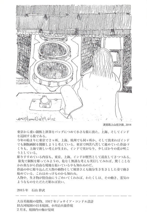 旧古河庭園内大谷美術館(ジョサイア・コンドル設計)を会場とする石山修武銅版画展は建築家コンドルの生涯を賭けた異境日本への想いをささやかなテーマにしたいと考えました。インド、中国他でこれからやってみたいことを銅版に彫ってみました。