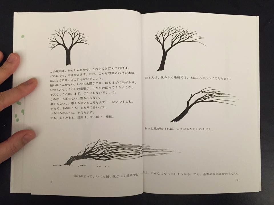 こんなふうに、身の周りの木に意識を向けるようになった頃、ブルーノ・ムナーリの絵本『木をかこう』に巡り会いました。この本にはさまざまな木が描かれていますが、木の上手な描き方のお手本を示すためのものではありません。そうではなくて、さまざま木の姿を、その形を作り出す「規則」を意識しながらじっくりと観察する過程そのものを丁寧に描き出し、注意深く対象を見つめるということはどういうことなのかを解き明かしているのです。一本一本の木に寄り添って、親しい人に語りかけるようなムナーリの文章は、語深い含蓄を帯びています(須賀敦子による訳文も素晴らしいのです)。 たとえば風の力で木のかたちが変わっていく様子を描いたところ(図5)ではこのように語っています。