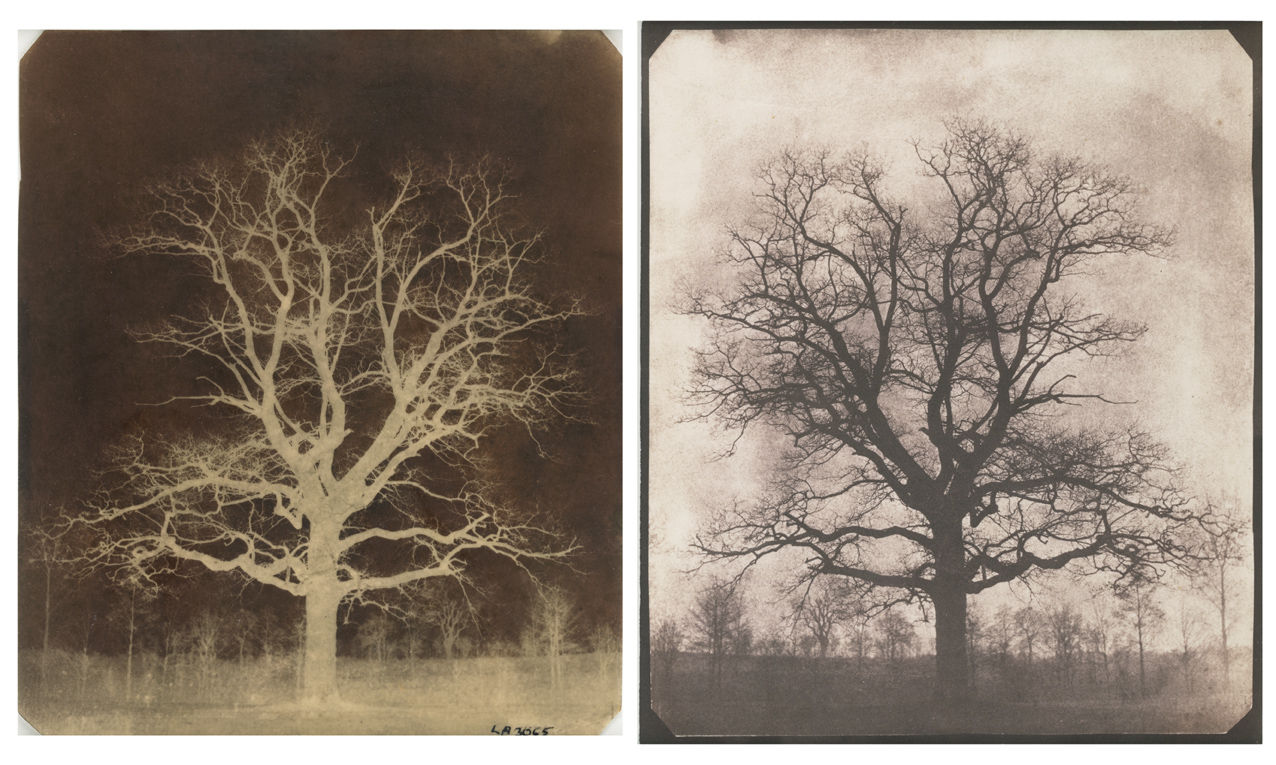 日常生活の中で木を意識したり、木の写真を撮ったりするようになると、これまでに見てきた写真史上の作品の中でも木が写っているものを思い出したり、写された木をその空間との関係に注意しながら見直したりするようになりました。たとえば、黎明期の写真術であるカロタイプの発明者ウィリアム・ヘンリー・フォックス・タルボット(William Henry Fox Talbot,1800-1877)が紙のネガと大判カメラを用いて撮影した「冬のオークの木」(図7ネガ像とポジ像)が挙げられます。以前見た時は、枝を広げたオーク(楢)の木の形にしか印象に残っていなかったのですが、改めて遠景に立ち並ぶ小さな木々のシルエットも注意深く見ていると、画面に捉えられた空間の奥行きや広がりが立ち上がってくるように感じられます。