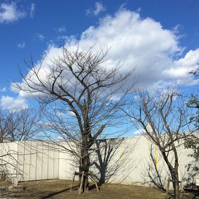 以来、娘の保育園の送り迎えや通勤の途中にも、街路樹や公園の植木など、さまざまな木に眼が惹き寄せられるようになりました。晴れた冬の日の光は透き通っていて、木々の輪郭がくっきりと際立って見えます。建物や路面の上に落ちる街路樹の影(図2)や、あたかも雲が木の枝に引っかかっているように見える様子(図3)など、木を意識して見ることで、見慣れていた場所のその時々の表情や変化に気づくようになりました。一人遊びのように木の写真を撮るうちに、それまでは寒々しい冬景色の一部のようにしか見ていなかった落葉樹にも、それぞれの木の種類に固有の枝の伸び方や全体としての姿形が具わっている、というごく当たり前のことが新鮮なこととして眼に映るようになってきたのです。