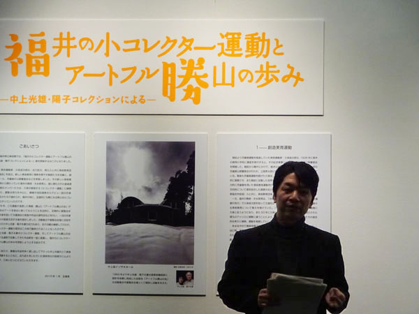 こちらでは展覧会「福井の小コレクター運動とアートフル勝山の歩み中上光雄・陽子コレクションによる」を観覧。広いフロアの中央にパーテーションを設置したシンプルな展示空間には、難波田龍起、瑛九、オノサト・トシノブ、靉嘔、磯崎新などなど多くの著名な日本人作家の作品が並びます。こちらではまず学芸員の西村さんによる、勝山で興った小コレクター運動についてのレクチャーです。