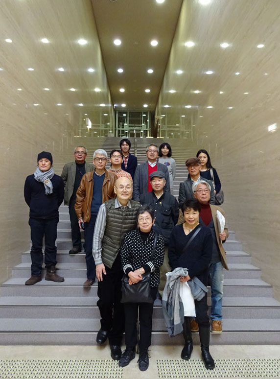 左から、浜田宏司さん、六本木久志さん、石原輝雄さん、西山郁夫さん、芳賀言太郎さん(奥)、綿貫不二夫、綿貫令子、植田実先生、中村孝幸さん、神林菜穂子さん(奥)、料治幸子さん(手前)、酒井実通男さん、塩澤和夫さん、尾立麗子(奥)そして、県立美術館を出てバスで向かったのは、磯崎新氏による設計の中上邸イソザキホールが建つ勝山市です。