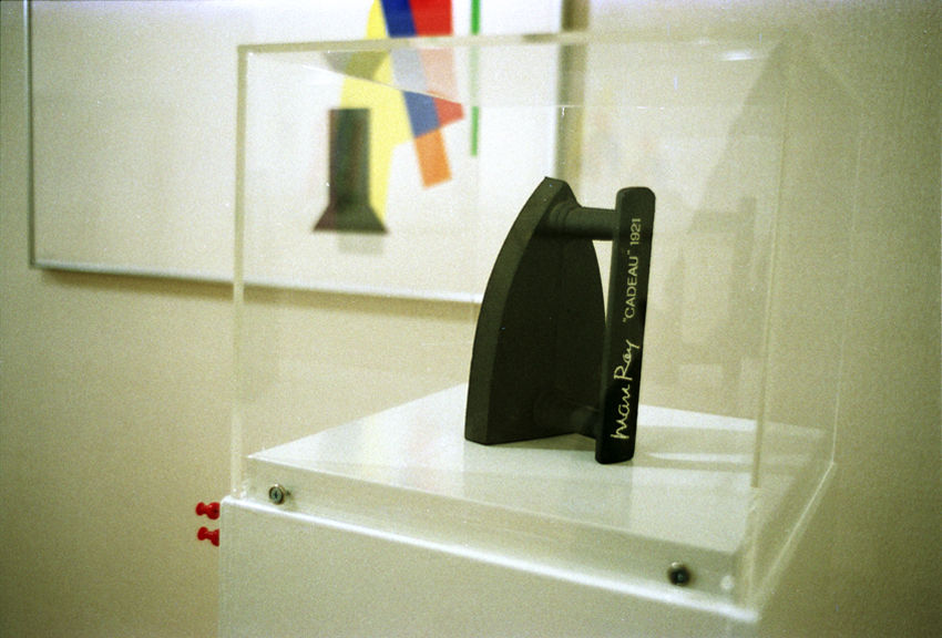 展示されているアイロンは、1974年にイタリアのルチアーノ・アンセルミーノが限定300個を再制作させたもので、限定番号とマン・レイのモノグラムサインが記されたカードとセットになっており(本作は50番)、これに未亡人となったジュリエットの証明書(1982年6月3日付)コピーが付されている。制作数が多いので、わたしにも購入可能な価格となった訳だが、児玉画廊のデイレクター加藤義夫氏の様々なサポートのお陰だったと感謝している。イタリアから持ち帰るとき、空港の荷物検査で止められないよう「土産品」と言って、そのまま手に持ってゲートを潜られたと氏から聞いた。展覧会カタログの紙面でアイロンを見る度に、その姿を想像して楽しい気分に包まれる。カタログの「あとがき」で、現代美術の源泉でもあるダダを画廊の原点とすると宣言された加藤氏は、「「視覚的網膜的な楽しみ」と「観念」とが共存しているようなマン・レイの作品群を通じてダダを理解することによって現代美術理解の糸口となれば幸いと思います。」と記している。