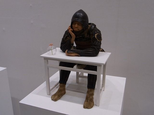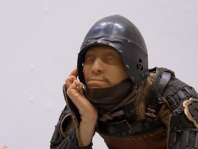現代風の机に座って居眠りする鎧武者。高さ40cmにも満たない作品ですが、鎧や肌の質感は勿論、髭や眉毛、睫毛すら描かずに植毛してある徹底振り。他には脛毛を生やした作品もありました。