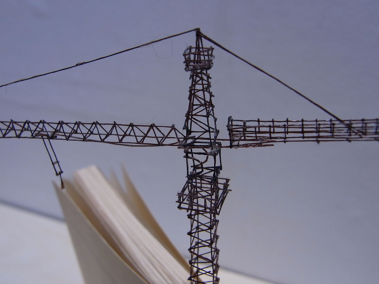縦に置いた文庫本の上に造形された建築用クレーンですが、キャプションにある材料は文庫本のみ。