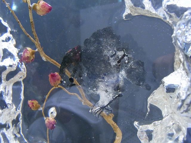 透明な材質で作った鳥の彫刻に着彩し、それを更に透明な材質で包み込むことで、まるで水墨画が立体化したように見える作品です。