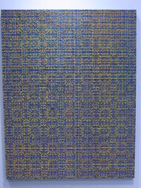キャンバスに油彩を塗るのではなく、線状に置いて重ねることでパターンを描いている作品。