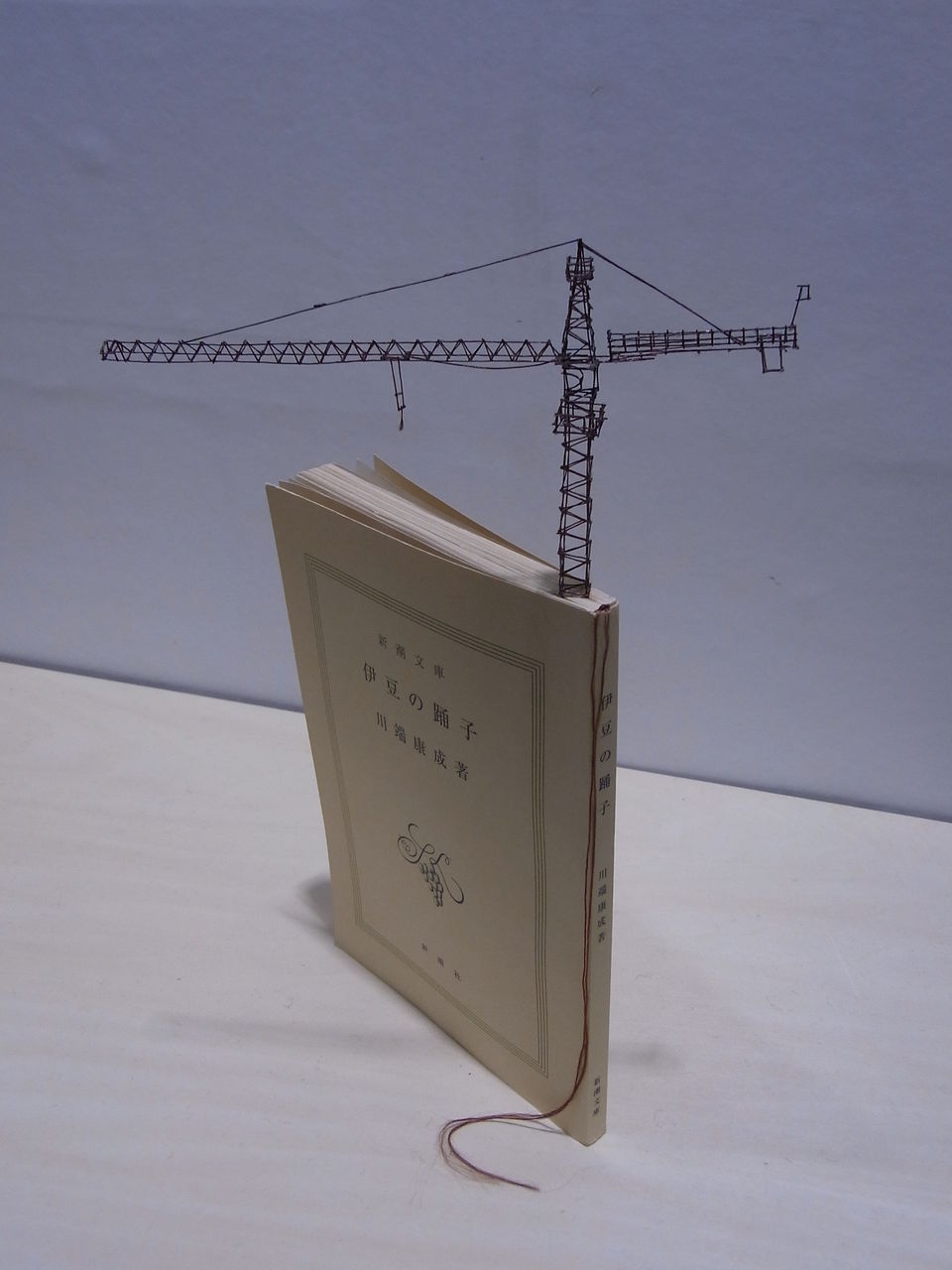 今回のスタッフS一押しの作品。縦に置いた文庫本の上に造形された建築用クレーンですが、キャプションにある材料は文庫本のみ。