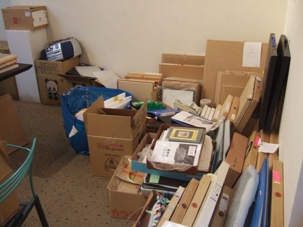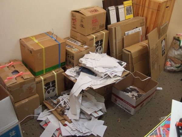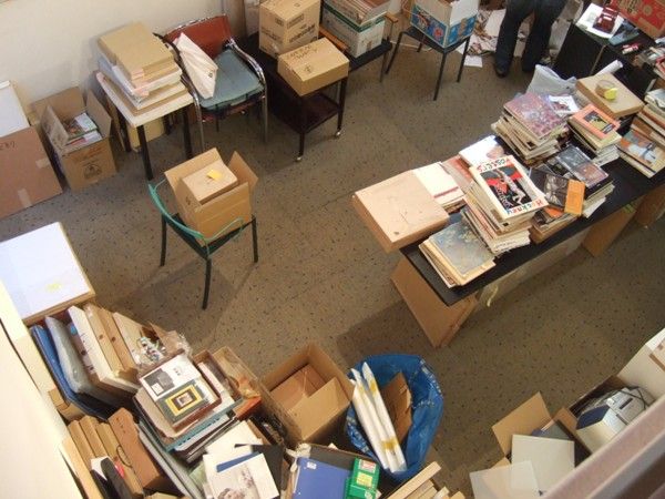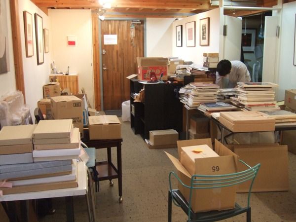 二階の事務スペースがあふれかえる作品やら資料・書籍でスタッフが押しつぶれそうになっており、このままほっておくと暴動に発展しかねない。思い切って二階から大量の荷物をおろし、整理(破棄、倉庫への移動)に踏み切った次第です。