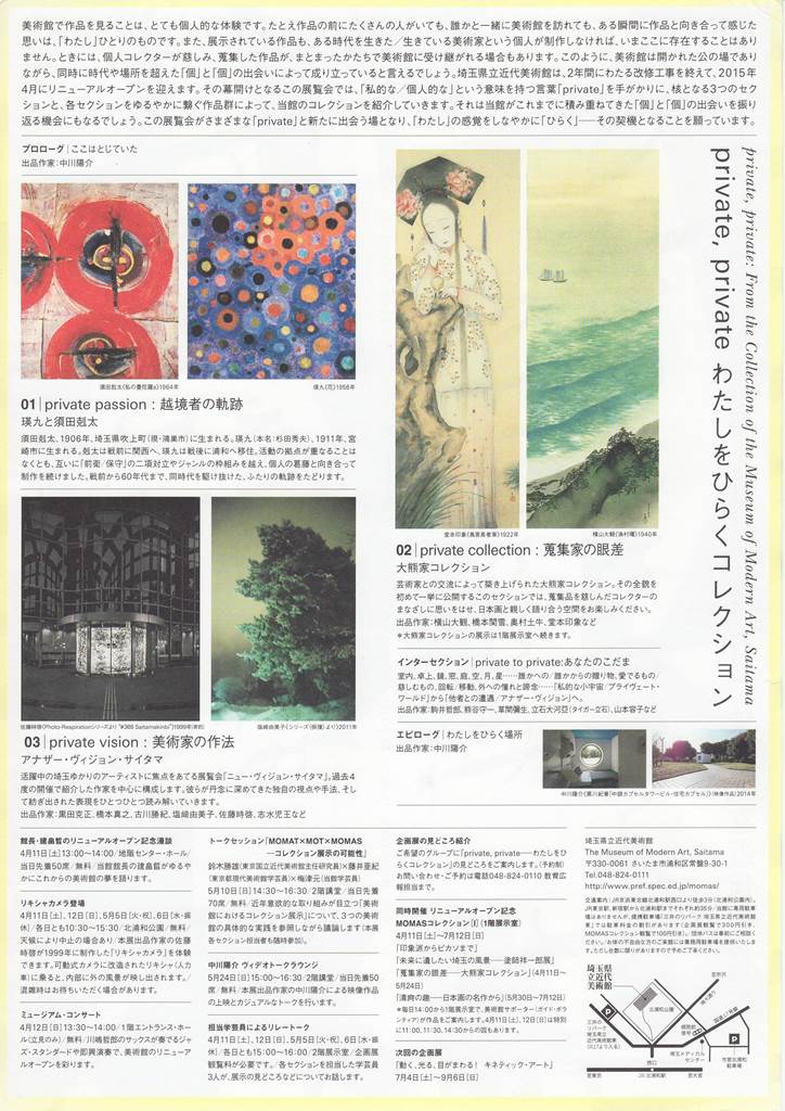 この展覧会では、「私的な/個人的な」という意味を持つ言葉「private」を手がかりに、核となる3つのセクションと、各セクションをゆるやかに繋ぐ作品群によって、当館のコレクションを紹介していきます。それは当館がこれまでに積み重ねてきた「個」と「個」の出会いを振り返る機会にもなるでしょう。(同展HPより転載)