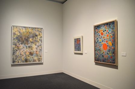 真っ白な壁面に色鮮やかな瑛九の晩年の作品が掛かっている。左から《雲》、《花》、《青の中の黄色い丸》。