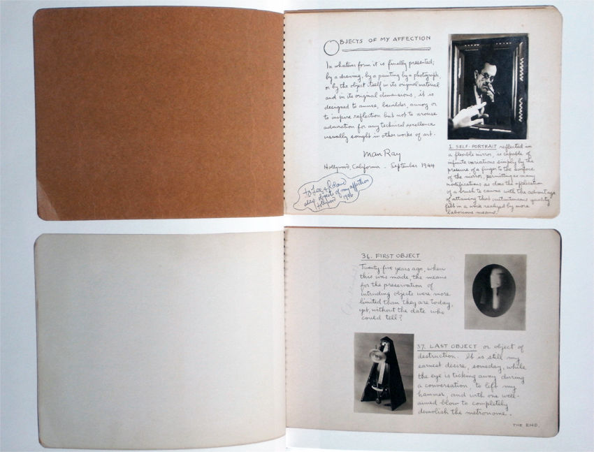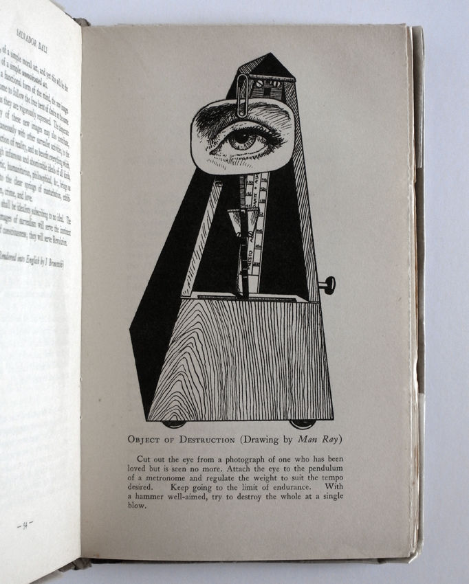 それは、ニューヨークで発行された雑誌に『ジス・クォーター』(1932年9月号)に掲載した『破壊のオブジェ』と題する素描で、下段に「愛していたのにもう会うことの出来ない人の写真から、その眼を切り抜く。メトロノームの振り子にこの眼を取り付け、思い通りのテンポになるように重りを調整する。そして、忍耐の限度まで鳴らし続ける。ハンマーで狙い定め。そのすべてを破壊する。」(55頁)と怒りの指示をしている。メトロノームの現物は、翌年6月にピエール・コル画廊で開かれた『シュルレアリスム展』に、『眼 ─ メトロノーム』(出品番号61)』と題して出品、『マン・レイの写真集 1920 ─ 1934 巴里』の表紙習作でも確認できる。マン・レイの友人たちは、雑誌での「指示」を知っていただろうから、テーブルに置かれたメトロノームを前にして、彼の気持ちを察していただろう。──現物を手にしているわたしも、そんな気持ちになってしまうのである。