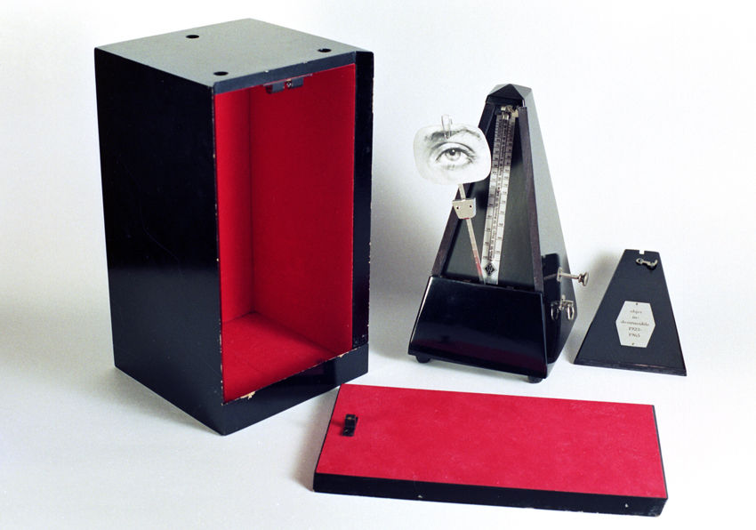 京都市内の骨董店で、マン・レイがオブジェの再制作に使ったメトロノームを見かけたのは、バブル景気の終わった頃だった。見覚えのあるドイツの老舗ウィットナーのマークが付いた木製の黒塗光沢仕上げで、値段も手頃。「眼」の写真の方はシュワルツのマン・レイ個展カタログ(1964年)の裏表紙を切り抜いて作れるし、ゼムクリップは机の引き出しに沢山あったはずだし── 購入して再制作(?) したいと心が騒いだが、これに手を染めたら「『おしゃれ泥棒』のパパ、シャルル・ボネになってしまうぞ」と踏みとどまった。