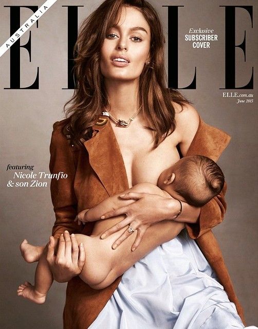 女性向けのファッション雑誌『ELLE』のオーストラリア版(2015年6月号)では、スーパーモデルのニコール・トルンフィオ(Nicole Trunfio, 1986-)が、自身の生後4カ月の息子を抱いて素肌に羽織ったジャケットの前を開けて授乳するポーズで写っている写真が表紙を飾り、大きな反響を呼びました。(ちなみに、授乳の場面を撮影することは前もって意図されておらず、撮影現場にいた赤ちゃんに急遽授乳しなくてはならなくなったために、授乳中にその場の流れで撮影されたものだそうです。)トルンフィオは、自身のinstagramでこの『ELLE』誌の表紙を、#normalizebreastfeedingという公共空間で授乳する権利を求めるメッセージを込めたハッシュタグをつけて公開しています。