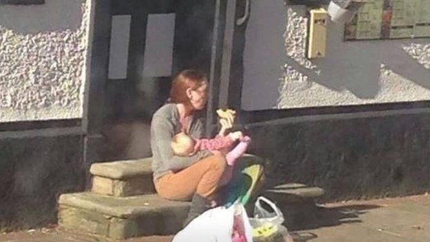 公共空間で授乳を求める運動は、SNSを通したこのような授乳写真の広がりと密接に結びついていますが、SNSには公共空間での授乳に対する批判的な意見とともに公開される(厳密に言えば「晒される」)写真もあります。たとえば、イギリスではエミリー・スローという女性が買い物途中に路上で授乳をしている姿を盗み撮りされ、その写真が彼女のことを「浮浪者」のようだ、という中傷的なコメントとともにFacebook上に匿名で公開される、ということがありました。(図4)この女性はこの卑劣な匿名の投稿に対して抗議するために、公共空間で授乳する権利を主張するためのデモを呼びかけ、1000人近くの賛同者が集まったそうです。