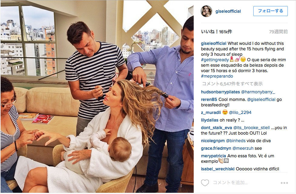 ブンチェンが「15時間のフライト後、3時間しか寝ていない状態で、3人美容部隊がいなかったら、どうしたらいいの。」というキャプションとともに(図3)の写真をinstagramで公開した時には大反響を呼び、彼女のような著名人が授乳の場面を公開することにたいして、「自然な行為だ、とても美しい」と賞賛する声もあれば、「授乳という私的な行為を公にするべきではないのでは」「多くの母親にとっての授乳とはかけ離れて非現実的に見える」といった批判を含むコメントが寄せられ、ネット上での反応がABCニュースで取り上げられたりもしました。