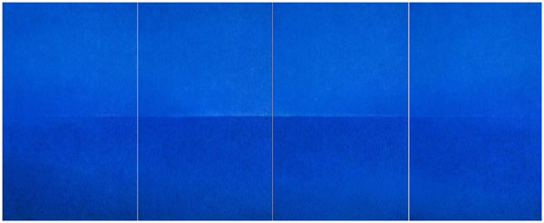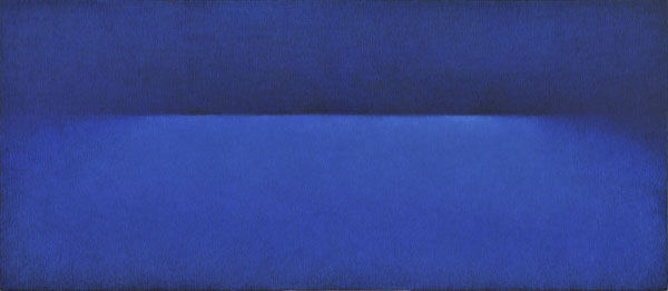 ギャラリーで実際に作品を見てみるとハガキで見たものとはかなり印象が違う。作品の表面にはベニヤ板のような凸凹が見え、その凸凹の線ごとに少しずつ色が違う。近づいてみるとその細密なテクスチャに目が行くが、少し離れてみるとまるで点描のように個々の線の印象が消え、ただ暗い海と空が仄かに光る様子が広がる。