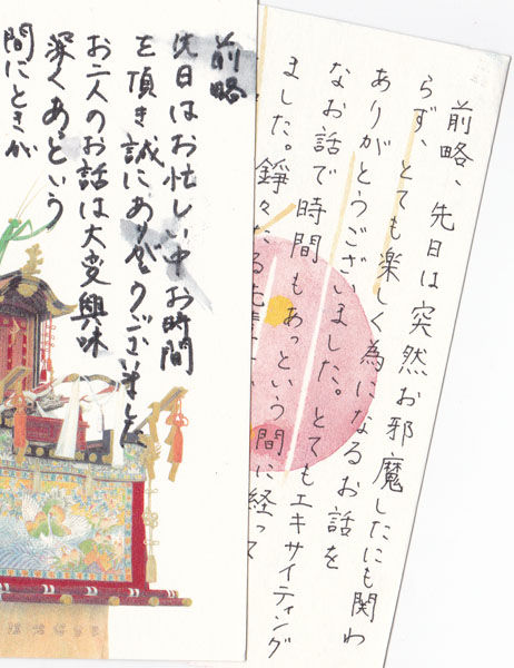 もうあの二人、あきれて二度と来ないだろうなあ、帰国した若くて美しいわがスタッフたちにため息を漏らしていたら(考えてみれば最大の被害者はうちのスタッフなんだよねえ、いくら労働条件が良くっても毎日じゃあたまったもんじゃない、と今気付きました)、思いもかけず手書きの美しいおはがきをいただきました。