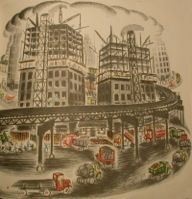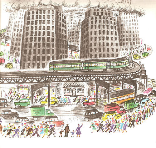 さらに都市化が進み、鉄道が路面だけではなく、高架線や地下鉄にまで拡張していくようになると、煉瓦造の建物を押しのけるようにして、1910年代後半以降急増したセットバックの摩天楼が表れます。絵本の中では、摩天楼の上層階の部分にクレーンが設置され、建設中の様子も描かれていますが、このような情景は、ドキュメンタリー写真の先駆者として知られるルイス・ハイン(Lewis W. Hine 1874-1940)がエンパイア・ステート・ビルディングの建設中に、脚が竦むような高所の現場で働く工夫たちをとらえた『Men at Work: Photographic Studies of Modern Men and Machines(働く男達:現代人と機械の写真による調査)』(1932)の写真に照らし合わせてみると、より臨場感を持って、当時の様子を感じ取ることができます。