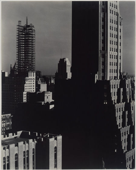 完成したセットバックの摩天楼は、上層階が雲に隠れてしまうほど高いものとして描かれています(図9)。このような超高層ビルを捉えた写真として思い浮かぶのが、近代写真の父と称されるアルフレッド・スティーグリッツ(Alfred Stieglitz, 1864–1946)が、当時マンハッタンで居室とギャラリーを構えていたシェルトン・ホテルの窓から撮影された写真です。スティーグリッツは次々に建造される摩天楼を観察し、建物や窓、セットバックの壁面が作り出す影を幾何学的な形、パターンとして画面の中に収めています。