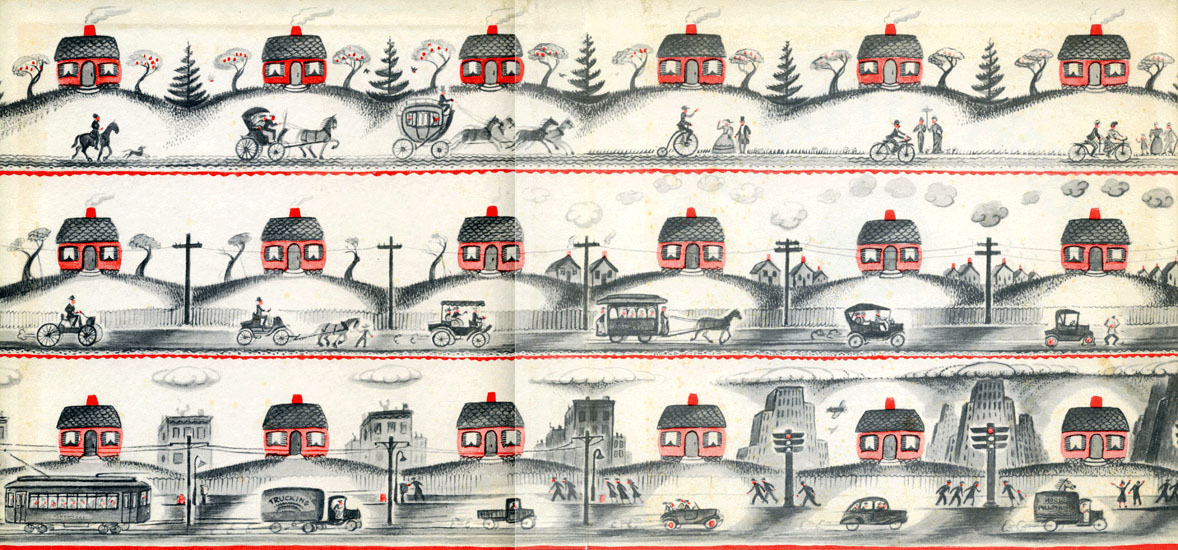 この物語は、作者のバートン自身が1910年代から30年代にかけて体験したアメリカ社会の変化、とくに第一次世界大戦後に急速に進行したモータリゼーション(車社会化)をベースに描かれています。絵本の見返し(図2)には、 ストーリーの流れをコマ送りで展開するように、ちいさなおうちとその周辺の環境と乗物の進歩(馬から馬車、自転車、自動車、路面電車、トラック)が連続するように描かれています。描かれている自動車が、ワゴン車のようなスタイルから、流線型のデザインへと変わっていくところに当時のデザインの状況が反映されています。