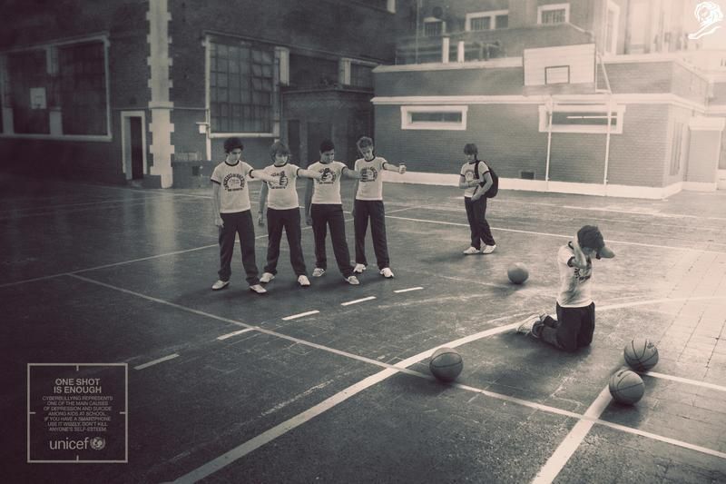 (原文:ONE SHOT IS ENOUGH “Cyberbullying represents one of the main causes of depression and suicide among kids at school. If you have a smartphone, use it wisely. Don’t kill anyocne’s self-esteem.”)
