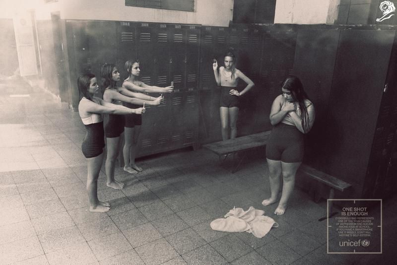 ONE SHOT IS ENOUGHという見出しと、少年、少女たちが軍団のように並び、腕を伸ばして銃を構えているかのようなポーズをしていることが示唆するように、ここでのSHOTとは、「撮影」と「発砲」という二つの意味が込められています。「発砲」という意味合いを強めて伝えるために、それぞれの画面の端の方が硝煙を暗示するように白く靄がかっています。人の弱みにつけ込んで、写真を撮影してインターネット上に晒していじめ、精神的に追いつめることは、その人に対する「射殺」、「処刑」のような行為に等しい、ということをこのキャンペーンは訴えかけています。