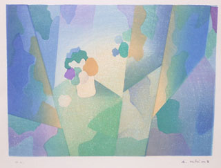 uchima_DM内間の代表作となったのは、伝統的な手摺りで45度摺を重ねた〈森の屏風 Forest Byobu〉連作です。鮮やかな色彩のハーモニー、微妙なぼかしが入った色面が幾重にも重なる複雑な構成、多色にもかかわらず画面全体には静かな気品が漂います。1950年代の初期から80年代の Forest Byobu 連作まで、多色木版約20点ご覧いただきます。