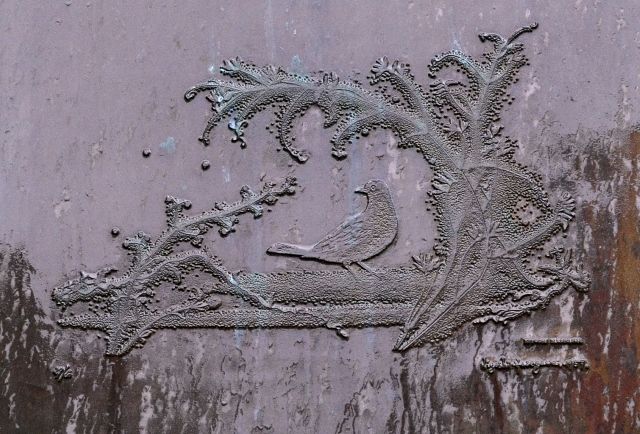 裏面には鳩。石柱には、長谷川潔の略歴と「一九八〇年九月開催された国際ロータリー第二五九地区大会を記念して、この碑を横浜市民に贈るものである」という銘がある。1981年6月に設置された。デザイン:加藤進治、制作:立体写真像株式会社。